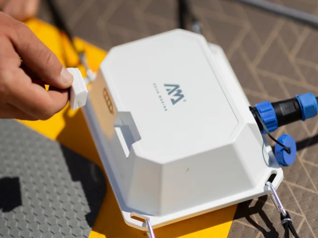 Tento odolný box bezpečně uchycuje baterii i řídicí jednotku motoru přímo na paddleboard, kde drží pevně díky elastickým popruhům. Zajišťuje spolehlivé připojení motoru, chrání elektroniku před vodou a obsahuje bezpečnostní pojistku pro okamžité vypnutí motoru v případě pádu.