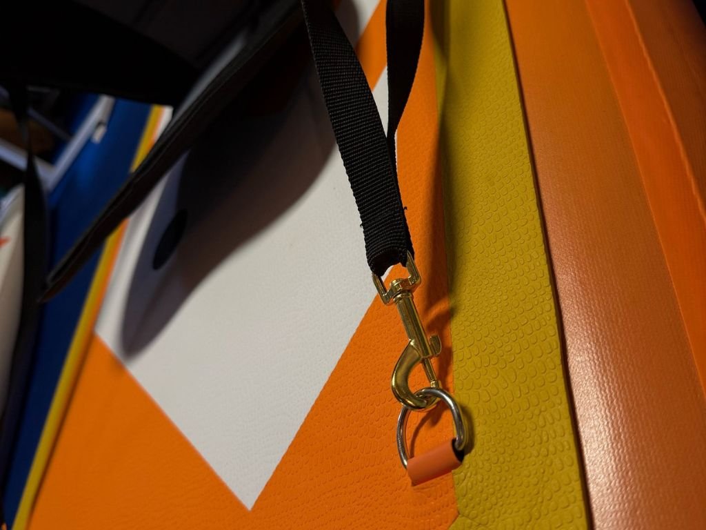 Bezpečnost je na vodě klíčová, a proto je paddleboard vybaven leashem na nohu, který zabrání jeho uplavání při pádu. Tento pružný popruh se připevňuje k zadní části boardu a pohodlně obepne kotník měkkým neoprenovým páskem. Při pádlování o něm téměř nevíš, ale v případě pádu udrží board nablízku. Neomezuje pohyb, je lehký a spolehlivý.