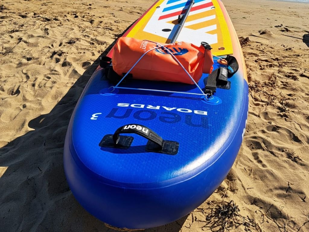 Na přední části paddleboardu se nachází elastické úložné popruhy, které umožňují bezpečné uchycení zavazadel, voděodolných vaků nebo jiného vybavení. Jsou pevně připevněny k palubě pomocí odolných D-ringů, což zajišťuje stabilitu nákladu i při pohybu na vodě. Díky pružnému materiálu se popruhy snadno přizpůsobí různým velikostem zavazadel a udrží je pevně na místě.