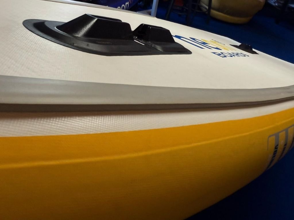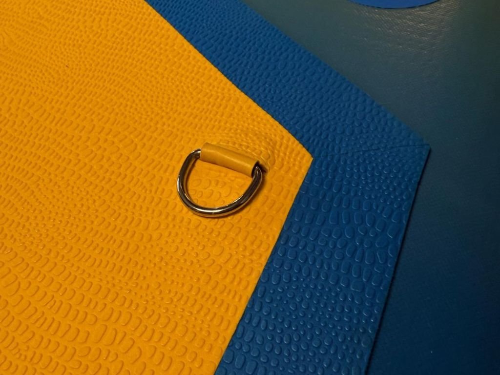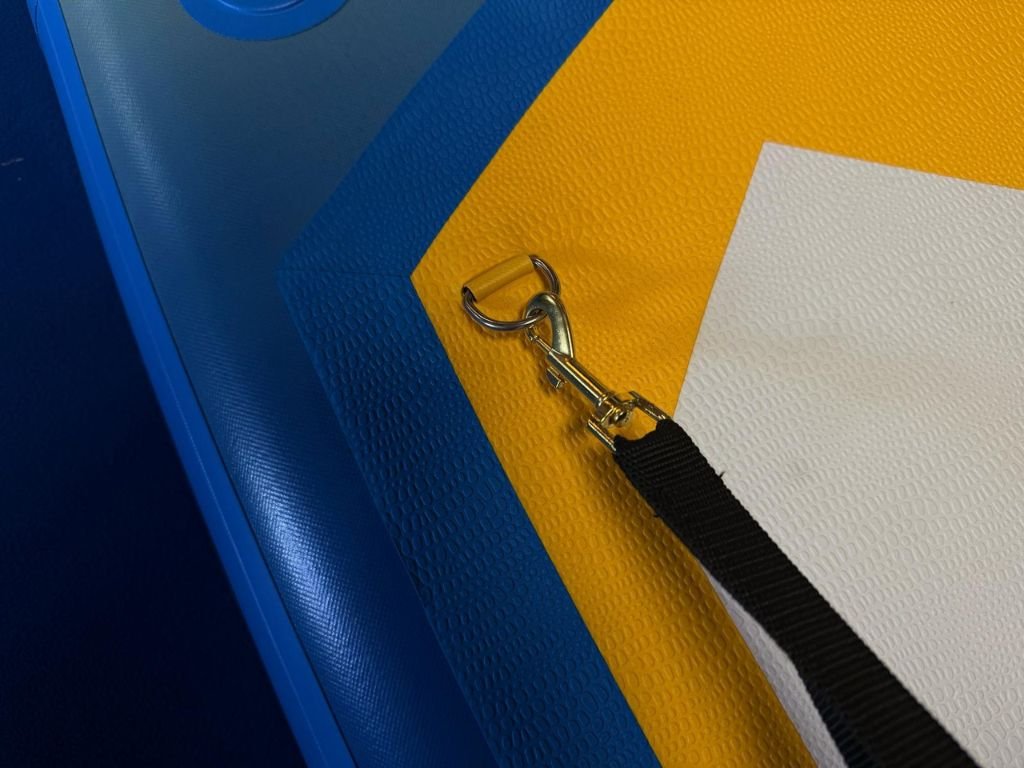 Na přední části paddleboardu se nachází elastické úložné popruhy, které umožňují bezpečné uchycení zavazadel, voděodolných vaků nebo jiného vybavení. Jsou pevně připevněny k palubě pomocí odolných D-ringů, což zajišťuje stabilitu nákladu i při pohybu na vodě. Díky pružnému materiálu se popruhy snadno přizpůsobí různým velikostem zavazadel a udrží je pevně na místě.